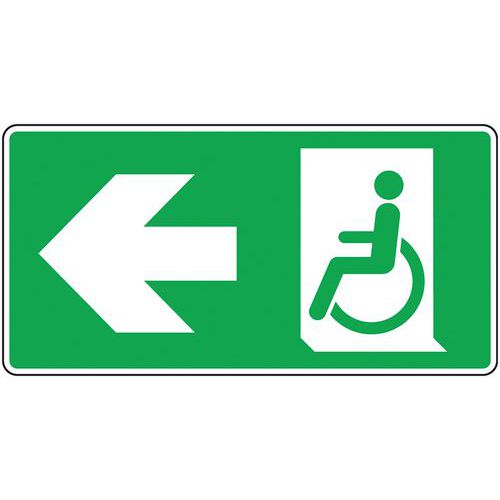 | Productnaam | Bord Rolstoeluitgang, pijl naar links, aluminium, Zelfklevend: nee, Stijf: ja, Norm ISO 7010: ja |