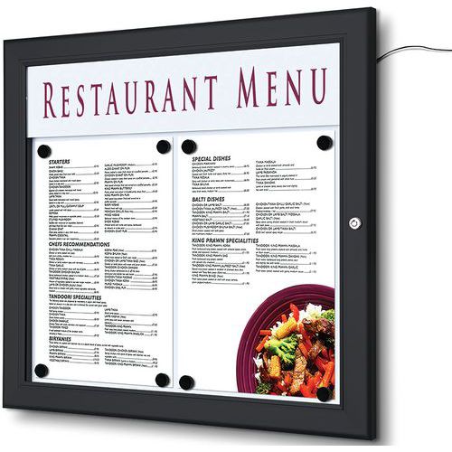 | Productnaam | LED outdoor wand menuhouder, Aantal vakken/kolom: 1, Kleur: Zwart, Frame materiaal: Aluminium |