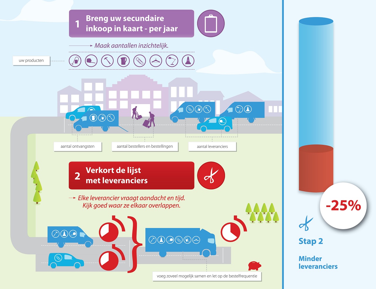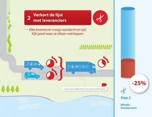 Bepaal eerst bij welke leveranciers maar een klein aantal producten wordt besteld. Zijn die producten ook bij de grotere leveranciers te krijgen? En als het niet exact hetzelfde product is, voldoet een ander merk dan misschien ook? Hoe kijken de werknemers daar tegen aan? Als ze zich alleen met een bepaald merk werkschoenen veilig voelen, moet je dat misschien zo laten. Dat de inkoop duurder wordt, weegt niet op tegen de kosten van ontevreden medewerkers. Maar maakt het ook echt uit welk merk stiften er in het magazijn gebruikt worden? Motiveer jouw handelswijze, maak duidelijke keuzes, maar zorg dat er nog wel wat te kiezen is voor de medewerkers.
