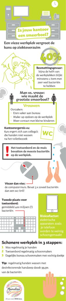 Een tekort aan persoonlijke hygiëne is ergernis nummer één onder collega’s. Toch is een gebrekkige hygiëne niet alleen ergerlijk, maar ook heel ongezond. Je brengt met je collega’s veel tijd op dezelfde plaats door, en als niet iedereen hygiëne hoog in het vaandel draagt, kan er zelfs een griepepidemie op de loer liggen.