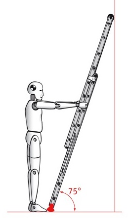 4. Stel de ladder stabiel op in een hoek van 75°. Je kunt dit zelf op een eenvoudige manier nagaan. Zet je tenen tegen de onderkant van de ladder en pak de ladder vast met gestrekte armen recht vooruit. Als je niet bij de ladder kan of als de armen niet gestrekt zijn, dan moet je de hoek aanpassen.