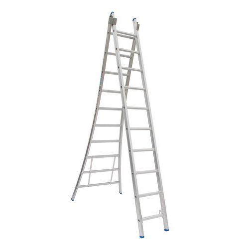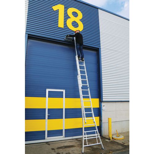 Schuifladder, deelbaar tot dubbele ladder. Tredehaken om de 2 elementen na het uitschuiven te blokkeren. Optimale zijdelingse stabiliteit gegarandeerd met de zeer brede, uitlopende basis. Tweedelige ladder met coating van polyester, vlekt niet op de handen.