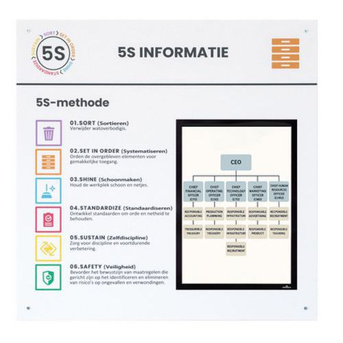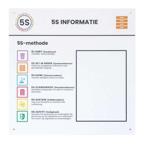 | Productnaam | Informatiepaneel 5S 750 mm, Zelfklevend: nee, Stijf: ja, Norm ISO 7010: nee, Materiaal: Slagvast polystyreen |