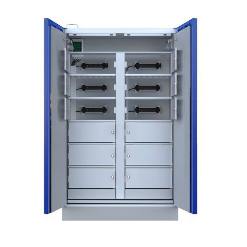 90 minuten brandwerende kast. Kast gecertificeerd volgens de normen EN14470-1 en EN16121. Transportsokkel voor pallettruck. Afzonderlijke opbergvakken. Contactdozen voor het popladen van de accu's. Opslag van lithiumbatterijen/-accu's.