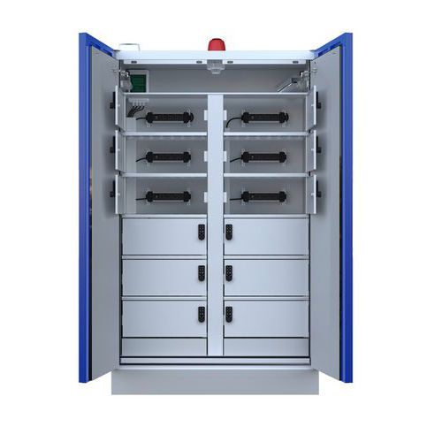 90 minuten brandwerende kast. Kast gecertificeerd volgens de normen EN14470-1 en EN16121. Transportsokkel voor pallettruck. Afzonderlijke opbergvakken. Contactdozen voor het popladen van de accu's. Opslag van lithiumbatterijen/-accu's.