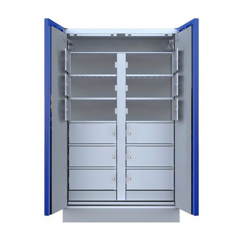 90 minuten brandwerende kast. Kast gecertificeerd volgens de normen EN14470-1 en EN16121. Transportsokkel voor pallettruck. Afzonderlijke opbergvakken. Opslag van lithiumbatterijen/-accu's.