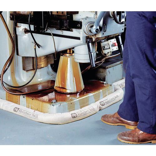 Flexibele kousen voor in de hoeken en aan de onderkant van machines om lekkende vloeistoffen te absorberen. Absorbeert de meest voorkomende industriële vloeistoffen: water, olie, oplosmiddelen, koelvloeistof en meer. Groot absorptievermogen, zelfs bij verzadiging. Omhulsel van polypropyleen voor een maximale scheurweerstand. Grijs gekleurd zodat vlekken niet opvallen. Voor dagelijks onderhoud