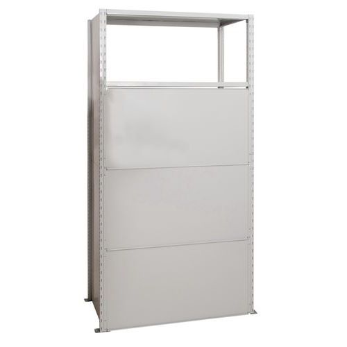 Stevig achterpaneel van massief gegalvaniseerd plaatstaal. Stabiliseert en verstevigt de constructie van de stelling. Te plaatsen in de staanders met behulp van haken. Epoxylak lichtgrijs, RAL 7035.