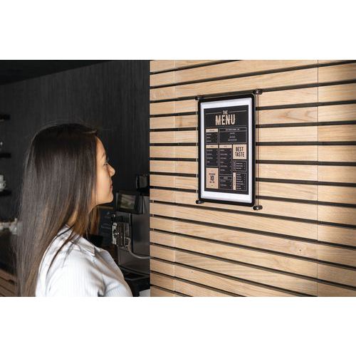 Er blijft dankzij de verbindingselementen wat ruimte tussen de affichehouder en de wand, voor een stijlvolle en professionele look.