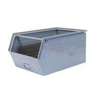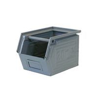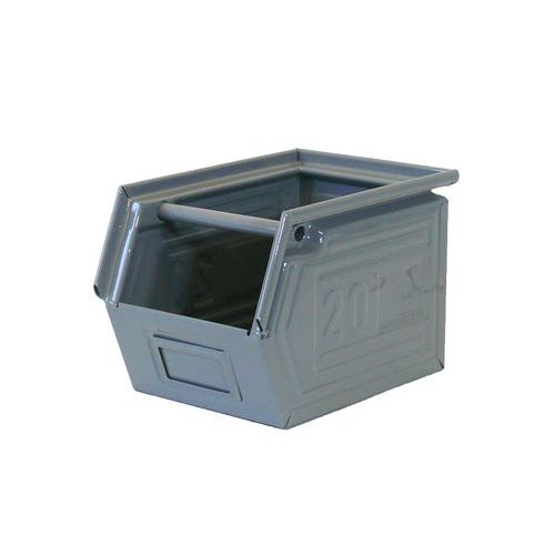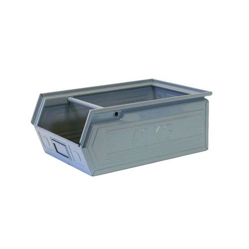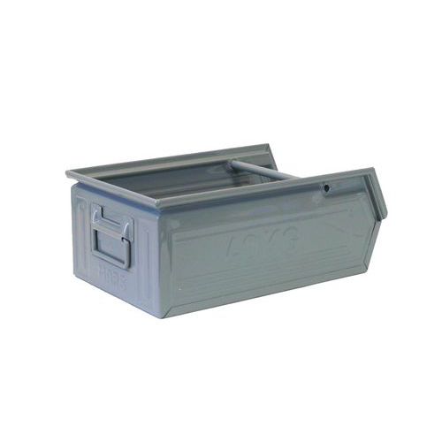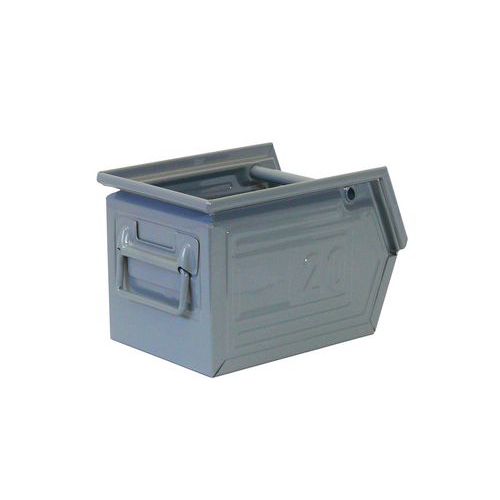 Afgeschuinde opbergdoos van plaatstaal voor een groot draagvermogen. Geïntegreerde etikethouder. Voorzien van een buis aan de voorzijde en een handgreep aan de achterzijde voor eenvoudig transport.