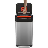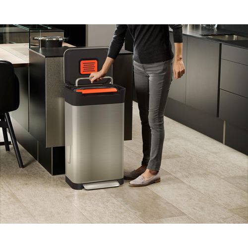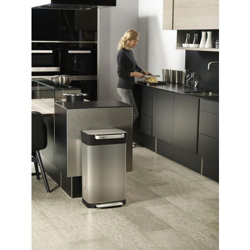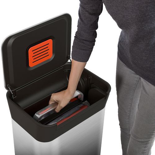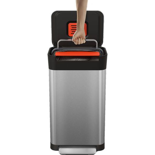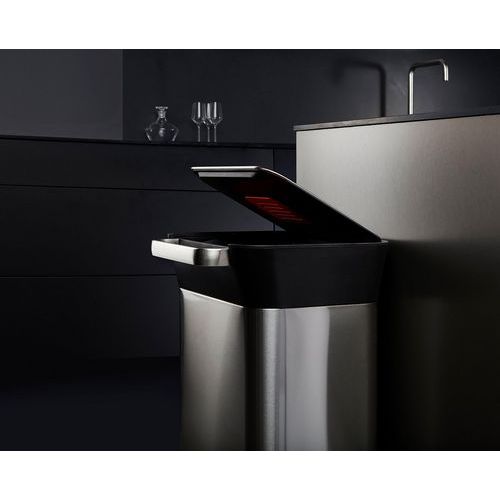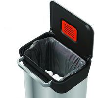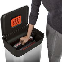 Stijlvolle pedaalemmer met ingebouwde, hygiënische afvalcompressor die het afval in de afvalbak aandrukt.