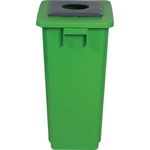 Rechthoekige afvalverzamelaar voor gebruik in kleine ruimtes. Eenvoudig te verplaatsen dankzij de handgrepen. Deze zeer praktische afvalbak is geschikt voor binnen. De kleuren van het deksel geven aan in welke bak het afval thuishoort.