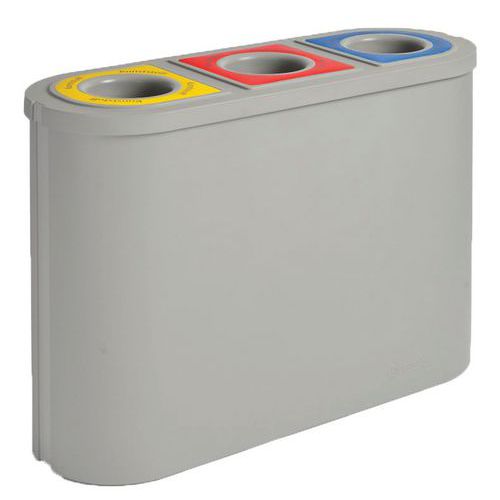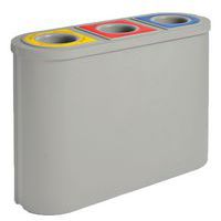 Station voor afvalscheiding voor 3 soorten afval: papier, kunststof en restafval (in 4 talen).
