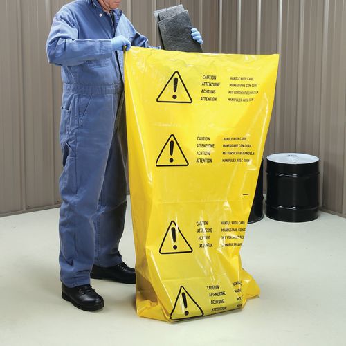 | Productnaam | Afvalzak voor gebruikte absorptiemiddelen, Materialen: Polyethyleen, Lengte: 76 cm, Hoogte: 46 cm, Kleur: Geel |