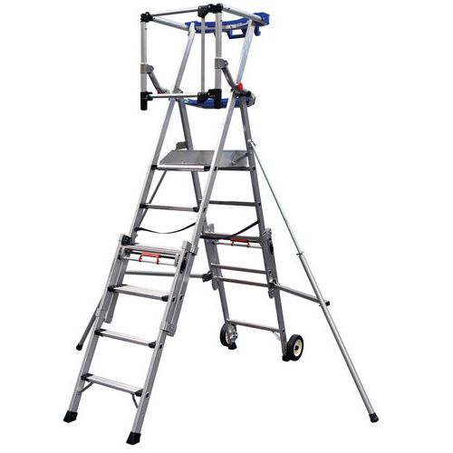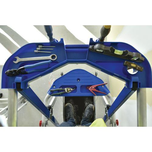 Telescopisch aluminium platform dat de mogelijkheid biedt om op verschillende hoogtes te werken. Direct uitvouwen. Toegang via antisliptreden. Installatie van de reling met één gebaar. 2 standaard legborden met vakken. Onderste legbord geschikt voor vat van 15 liter. Geoptimaliseerde afmetingen. Eenvoudig te verplaatsen op de bouwplaats. Intuïtieve hoogteverstelling: schuifvlakken bediend met handmatige bediening (gepatenteerd) met automatische vergrendeling. Zeer eenvoudig in te zetten millimeterstabilisatoren. Installatie in oneffenheden.