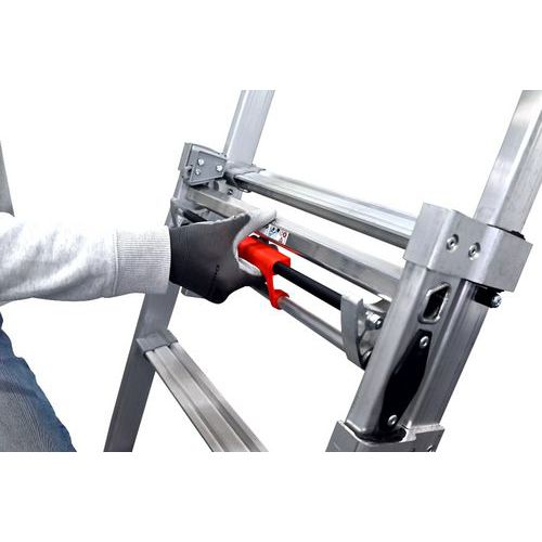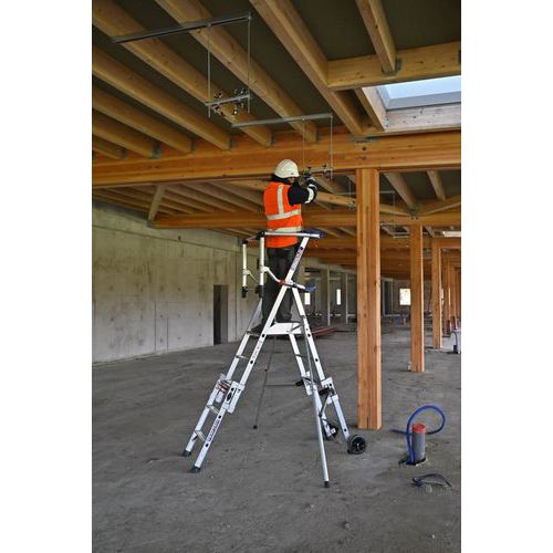 Telescopisch aluminium platform dat de mogelijkheid biedt om op verschillende hoogtes te werken. Direct uitvouwen. Toegang via antisliptreden. Installatie van de reling met één gebaar. 2 standaard legborden met vakken. Onderste legbord geschikt voor vat van 15 liter. Geoptimaliseerde afmetingen. Eenvoudig te verplaatsen op de bouwplaats. Intuïtieve hoogteverstelling: schuifvlakken bediend met handmatige bediening (gepatenteerd) met automatische vergrendeling. Zeer eenvoudig in te zetten millimeterstabilisatoren. Installatie in oneffenheden.