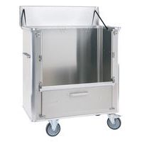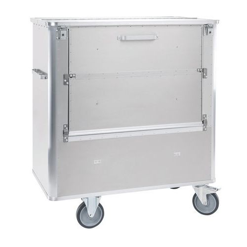Containerwagen van aluminium voor universeel gebruik. Hygiënisch, geurloos en roest niet. Ergonomisch en eenvoudig in gebruik, zelfs bij maximale belasting. Glad oppervlak met wanden zonder ribbels, voor een eenvoudige reiniging. De neerklapbare wand wordt in geopende stand gehouden dankzij twee magneten. Deksel met scharnieren, 2 bevestigingsriemen en 2 sluitingen met hendel. Hellende bodem met 2 afvoeropeningen die uitgerust zijn met een afvoerklep, dop en ketting. De bodem is afgedicht met silicone. Geanodiseerde handgrepen op de twee wanden aan de voorzijde.