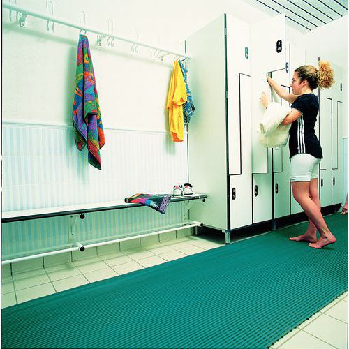 Rol met antisliprooster voor gemeenschappelijke ruimtes. Hygiënisch met niet-poreus materiaal en antimicrobiële, schimmelwerende additieven. Innovatief concept voor een ultra-efficiënte waterafvoer. Eenvoudig te versnijden, te plaatsen en te verwijderen roosters. Antislippatroon voor een uitstekende stabiliteit.
