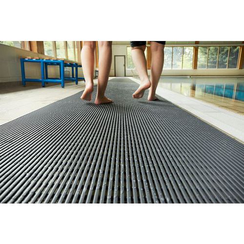 Antisliprooster per strekkende meter, voor gemeenschappelijke ruimtes. Hygiënisch met niet-poreus materiaal en antimicrobiële, schimmelwerende additieven. Innovatief concept voor een ultra-efficiënte waterafvoer. Eenvoudig te versnijden, te plaatsen en te verwijderen roosters. Antislippatroon voor een uitstekende stabiliteit.