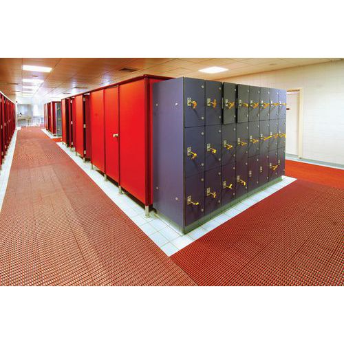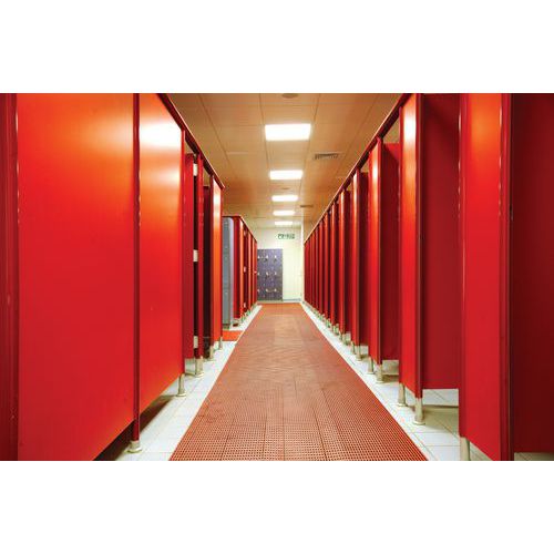 Antisliprooster per strekkende meter, voor gemeenschappelijke ruimtes. Hygiënisch met niet-poreus materiaal en antimicrobiële, schimmelwerende additieven. Innovatief concept voor een ultra-efficiënte waterafvoer. Eenvoudig te versnijden, te plaatsen en te verwijderen roosters. Antislippatroon voor een uitstekende stabiliteit.