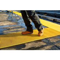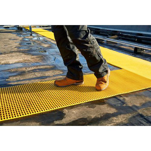 Grijs, flexibel PVC rooster voor technische wegen op platte daken, verkeersbruggen en hoge loopbruggen. Vloerbekleding met gecertificeerd antislip-diamantoppervlak, vrij te plaatsen zonder bevestiging. Niet-poreus materiaal, bestand tegen chemische producten, UV-straling en extreme weersomstandigheden. Duurzame constructie met 2 gekruiste lagen, open rooster voor een goede afvoer van vloeistoffen. Soepele onderkant: perfecte grip op de vloer en maximale bescherming van de ondergrond. Structuur bovenkant: dwarsstangen voor een stevige, maar comfortabele grip onder de voet.