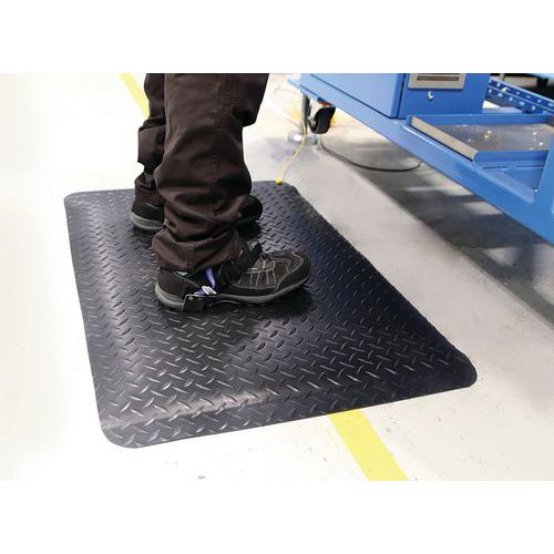 Sterke, antistatische antivermoeidheidsmat voor zones die gevoelig zijn voor statische elektriciteit. Vinyl oppervlak en rug van pvc-schuim, geassembleerd door smelten, niet gelijmd. Geleidende middenlaag voor bescherming van operators en componenten. Oppervlak bestand tegen talloze chemische producten. Standaard met schuine randen om het valrisico te beperken.