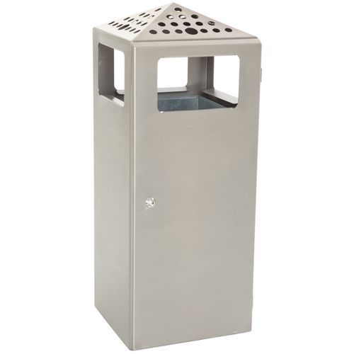 Robuuste vierkante as-afvalbak van metaal of rvs met 4 openingen en bovenkant (24x15 cm). De afvalbak heeft een deur die kan worden gesloten met een driehoeksleutel. Eenvoudig legen van de metalen binnenemmer met behulp van handgrepen. Wordt geleverd met een inzetstuk als aslade met een handgreep voor eenvoudig legen. Ideaal voor publieke ruimtes. Voor binnen en buiten.