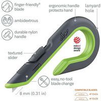 Inclusief 1 dubbelzijdig, door Slice gepatenteerd keramisch mes met een veilige afgeronde punt.