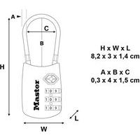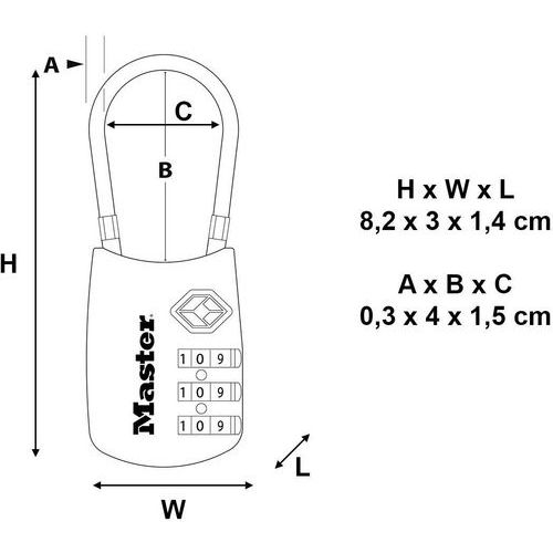 | Productnaam | Bagagehangslot 30mm TSA 3-cijferig, Beugel Ø: 3 mm, Aantal draaischijven: 3, Lengte: 82 mm, Hoogte: 4.3 cm |