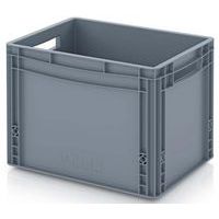 Euronorm-bak met dichte wanden. Euronorm-bak met dichte wanden en bodem, kleur grijs, van 10 l tot 175 l. Gebruikstemperatuur: -20°C tot +50°C. Polypropyleen, zeer dik.