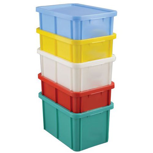 Bak met deksel en patroon voor identificatie van de inhoud. Faciliteert de integratie van een HACCP-werkwijze. Stapelbaar met of zonder deksel. HDPE. Gemaakt in de EU