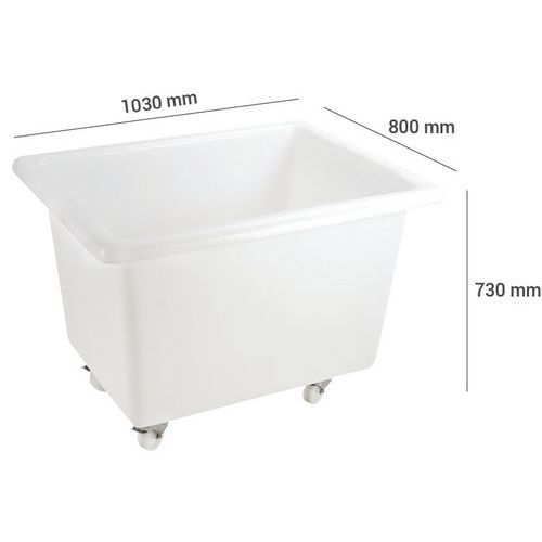 De economische oplossing om eenvoudig bakken met een groot volume te verplaatsen. Roestvrij stalen wielen en schroeven. Belastbaarheid is slechts een aanwijzing (hangt af van de verdeling van de belasting en de gebruikstemperatuur). Het aantal L komt overeen met een tot de rand gevulde bak. Bij een hoge belasting (220 L, 310 L en 500 L) van de bak op langere afstanden, kunt u beter gemengde wielen toepassen voor een betere manoeuvreerbaarheid of een wagenbak