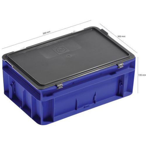 Stapelbare Euronorm-bak met deksel. Met deksel met scharnier met verstevigingen en 2 veersluitingen. Twee etikethouders aan 2 zijden (1 op de grote zijde aan de voorkant van de bak en 1 op een kleine zijkant).