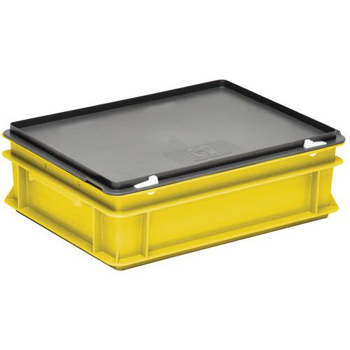 Stapelbare Euronorm-bak met deksel. Met deksel met scharnier met verstevigingen en 2 veersluitingen. Twee etikethouders aan 2 zijden (1 op de grote zijde aan de voorkant van de bak en 1 op een kleine zijkant).