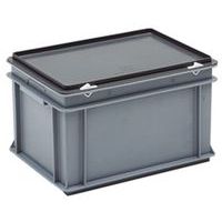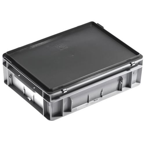 Stapelbare Euronorm-bak met deksel. Met deksel met scharnier met verstevigingen en 2 veersluitingen. Twee etikethouders aan 2 zijden (1 op de grote zijde aan de voorkant van de bak en 1 op een kleine zijkant). Gemaakt in de EU
