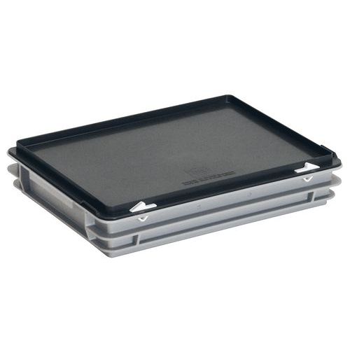 Stapelbare Euronorm-bak met deksel. Met deksel met scharnier met verstevigingen en 2 veersluitingen. Twee etikethouders aan 2 zijden (1 op de grote zijde aan de voorkant van de bak en 1 op een kleine zijkant).