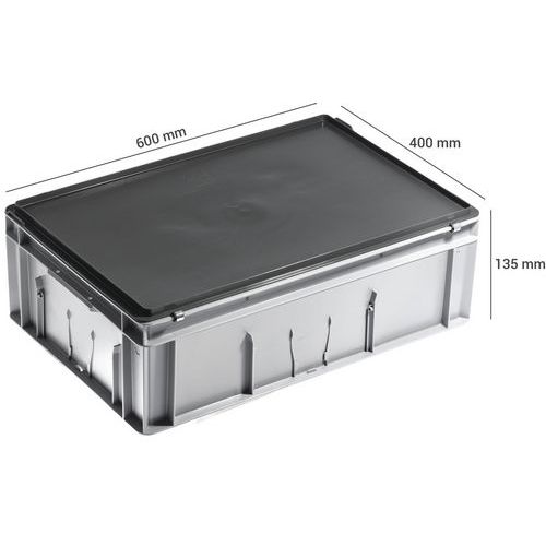 Stapelbare Euronorm-bak met deksel. Met deksel met scharnier met verstevigingen en 2 veersluitingen. Twee etikethouders aan 2 zijden (1 op de grote zijde aan de voorkant van de bak en 1 op een kleine zijkant). Gemaakt in de EU