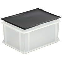 Stapelbare Euronorm-bak met deksel. Met deksel met scharnier met verstevigingen en 2 veersluitingen. Twee etikethouders aan 2 zijden (1 op de grote zijde aan de voorkant van de bak en 1 op een kleine zijkant). Gemaakt in de EU