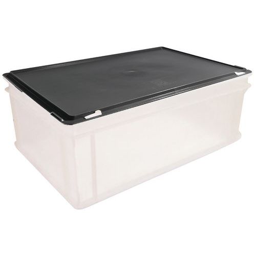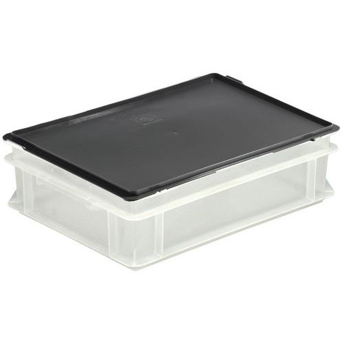 Stapelbare Euronorm-bak met deksel. Met deksel met scharnier met verstevigingen en 2 veersluitingen. Twee etikethouders aan 2 zijden (1 op de grote zijde aan de voorkant van de bak en 1 op een kleine zijkant).
