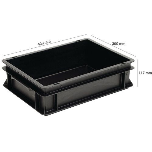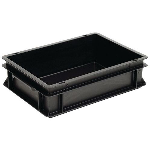 Euronorm-stapelbakken van geleidingsmateriaal met gesloten wanden en bodem of compact en twee Shell handgrepen of dichte handgrepen.