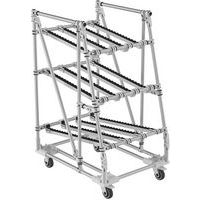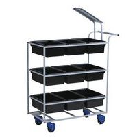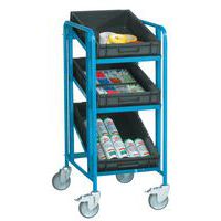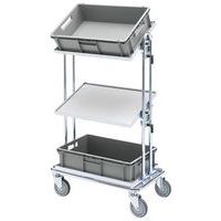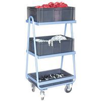 - Etagewagen klein met 3 etages, kantelbaar met Euronorm-bakken, met een mechanisch gelaste constructie van buisstaal.