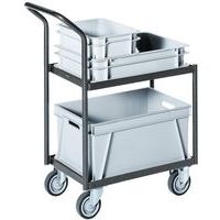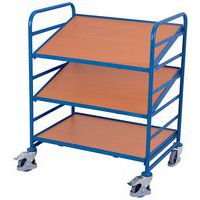 - Etagewagen klein met 3 etages, kantelbaar voor Euronorm-bakken, met een mechanisch gelaste constructie van buisstaal.