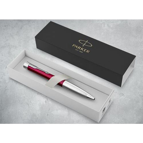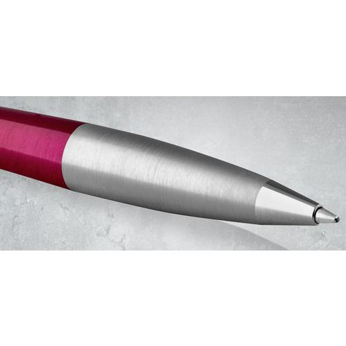 De glanzende afwerking in helder magenta wordt aangevuld door verchroomde details en een verchroomde houder, evenals de typische PARKER pijlclip.