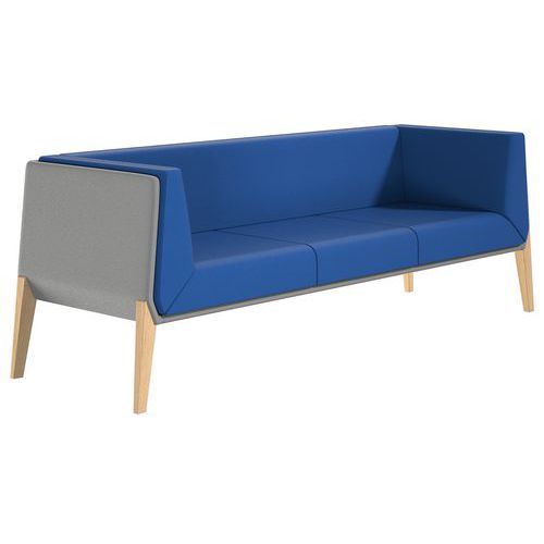 - Tweekleurige bank met drie zitplekken in een eigentijdse rechthoekige vorm.