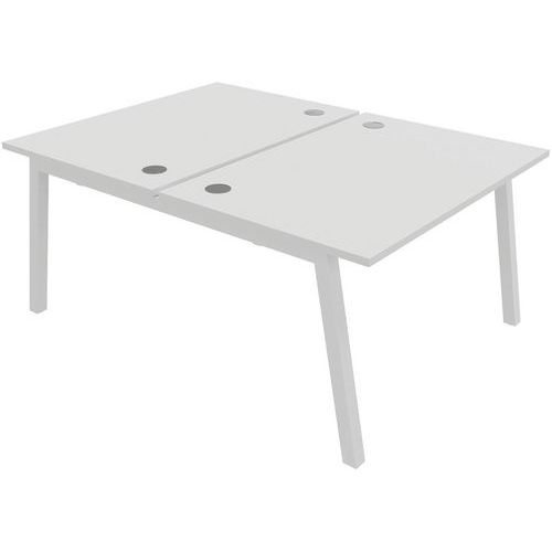 Ideale kantoorconfiguratie voor teamwerk. Recht duobureau met werkplekken tegenover elkaar met bladen van gemelamineerde panelen met een dikte van 25 mm, met antireflectie- en antikrasbehandeling en met antibacteriële eigenschappen. Bladen met elk 2 afsluiters, diam. 80 mm, voor het doorvoeren van kabels naar de optionele kabelgoot. Metalen onderstel met A-vormige boog, afgemaakt met een constructiebalk. Product kan aangevuld worden met de Bench 2 werkplekken vervolg Partage. Ontworpen ter bevordering van flexwerken en coworking. Creëer je mobiele werkplek en communiceer eenvoudiger met uw collega's. Kwaliteit E1, dichtheid 650 kg/m³. Schokbestendige ABS-randen van 2 mm.