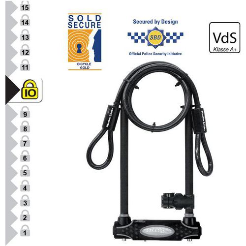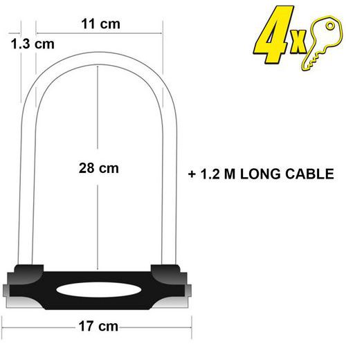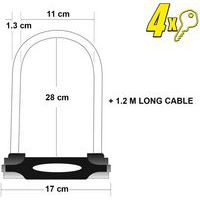 | Productnaam | Beugelslot U-slot met kabel XL 8285EUR, Ø: 13 mm, Lengte: 335 mm, Aantal sleutels: 4, Productgewicht: 1.67 kg |