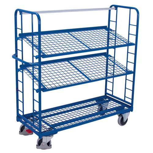 Etagewagen middel met 3 etages Uitvoering: Met duwbeugel van buis 2 kopse wanden met raster van 120 mm Inclusief verbindingsbuis tussen de kopse wanden voor stabilisering 1 vaste bodem, 2 variabele etagebodems, variabel inzetbaar in raster met 120 mm Etagebodem horizontaal of onder een hoek van 15° inhangbaar Bodem en etagebodems met draadgaas, maaswijdte 50 x 50 x 4 mm, draagvermogen per etagebodem: 50 kg Wiel van thermoplastisch rubber op kunststof velg met precisie kogellager, grijs, streeploos, 2 zwenkwielen met centrale EasySTOP rem en 2 bokwielen, zwenkwielen met voetbeschermer