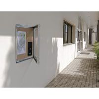 Waterdichte vitrine met ventilatieopeningen boven en onder de vitrine, om condensatie te voorkomen. Frame van geanodiseerd aluminium met afgeronde hoeken voor extra veiligheid. Vergrendelbare schuifdeur van veiligheidsglas van 4 mm, tegen vandalisme en gebroken glas. Montage van de deur voor openen naar rechts of naar links. Witte achterwand van kurk voor de bevestiging van uw documenten met punaises.