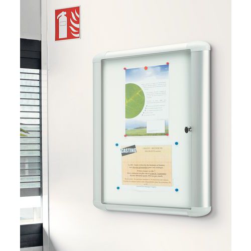 Binnenvitrine met frame van geanodiseerd aluminium voor een moderne en elegante uitstraling. Toon uw gegevens veilig dankzij de deur van veiligheidsglas. Handig: de metalen achterwand is magnetisch, zodat u documenten met magneten kunt plaatsen. Handige en vergrendelbare draaideur voor maximale veiligheid.