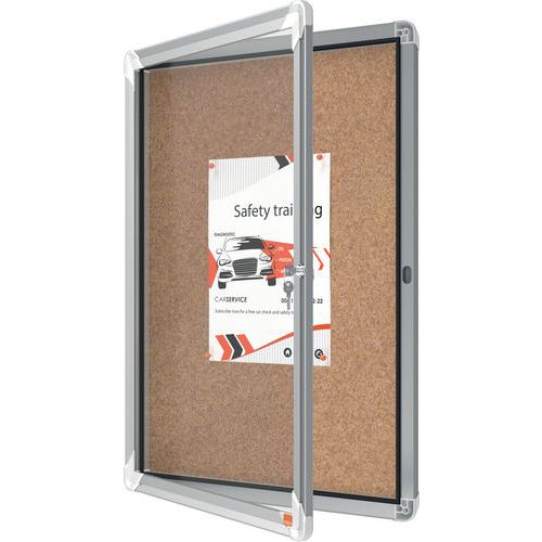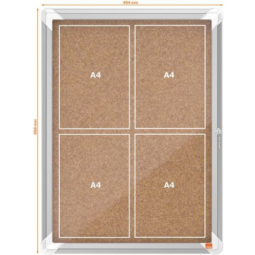 | Productnaam | Binnenvitrine Nobo met kurk bodem 4 x A4, Aantal vellen A4: 4, Deurmateriaal: Aluminium |